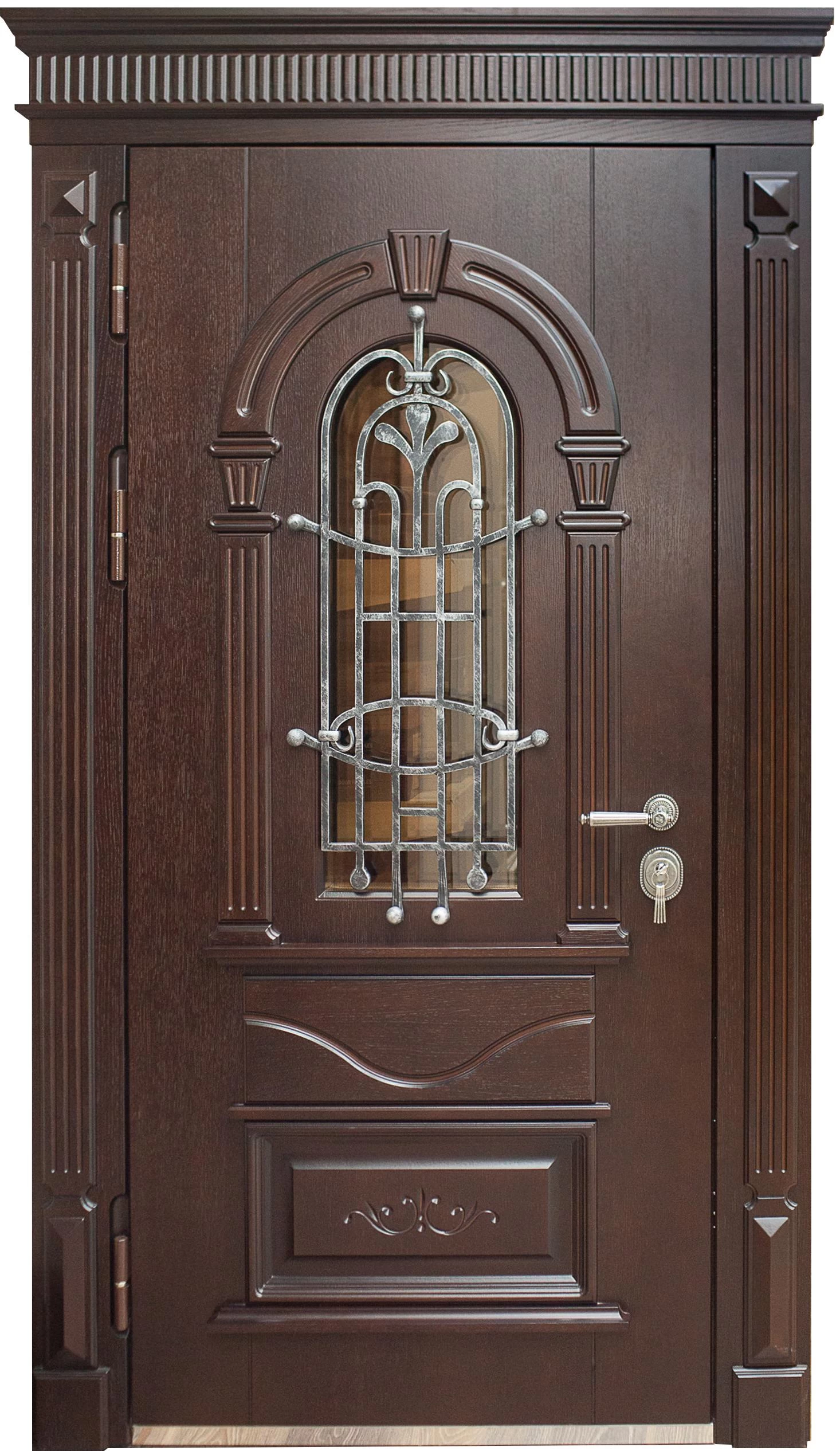 Поговорим об отделке. Вариантов декора дверей много. В большинстве случаев, для отделки элитных дверей используется массив натурального дерева или натуральный шпон с фрезеровкой. Цвет двери так же делается по желанию заказчика. Очень красиво и представительно выглядят двери с ковкой и стеклом.