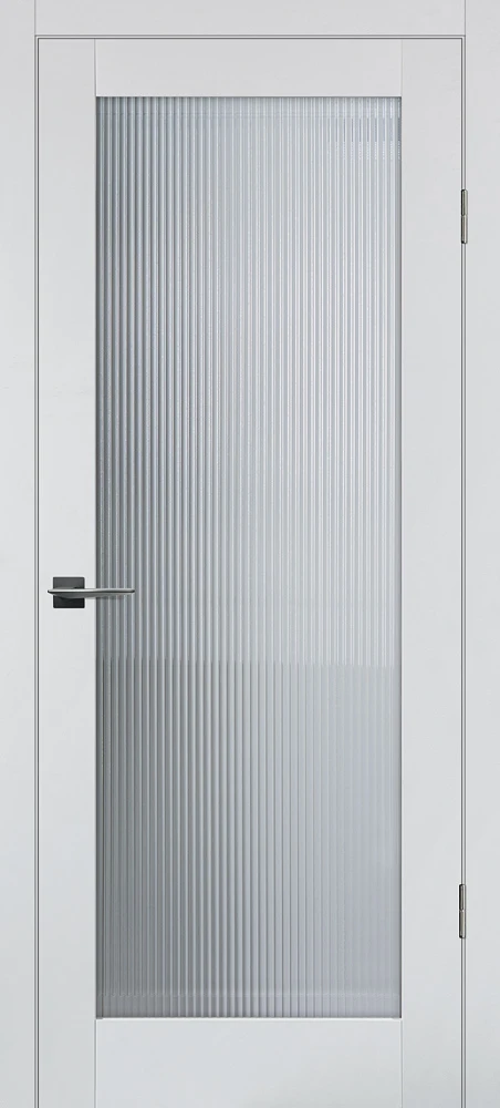 Царговое полотно, выполненное в гладком матовом покрытии, приятным на ощупь, обладающее высокими эксплуатационными характеристиками. Бескромочная технология. Полотно комплектуется объемной филенкой с фрезерованным рисунком "под рейку". В остекленных полотнах используется рифленное стекло с красивым прокатным узором в виде полос. Отлично смотрится в неоклассических и лофтовых интерьерах.